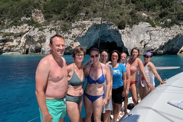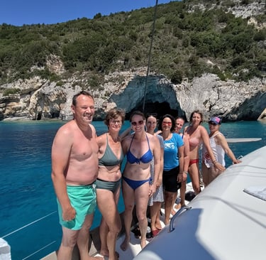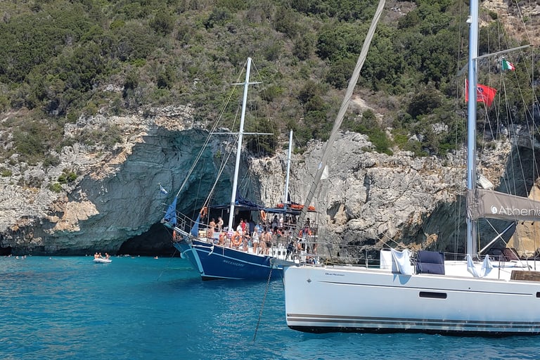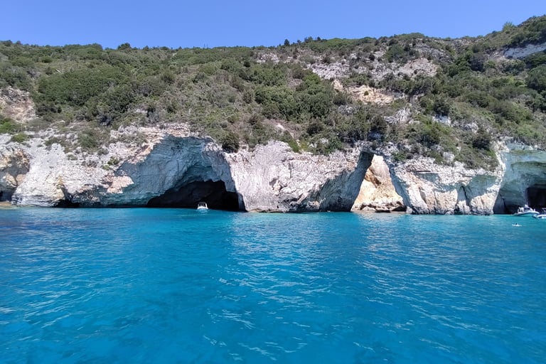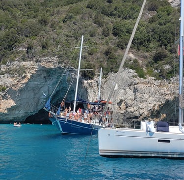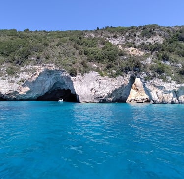 Nach dem Verlassen unseres Ankerplatzes umrunden wir die nördliche Spitze von Paxos auf der Westseite. Es gilt ein paar Felsen zu beachten, die Wassertiefe ist nicht allzu üppig. Und wir sind nicht allein - ein Ausflugsboot nach dem anderen passiert uns, teilweise haarsträubend nah und mit großer Welle. Wenn man dort alle Touristen hinkarrt, lassen wir es uns natürlich nicht nehmen, diesem Ort auch einen Besuch abzustatten.