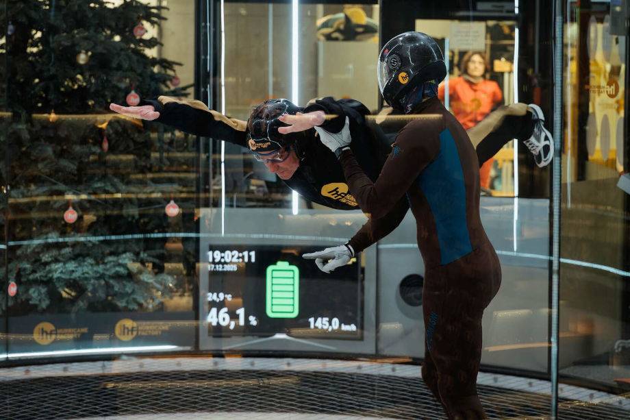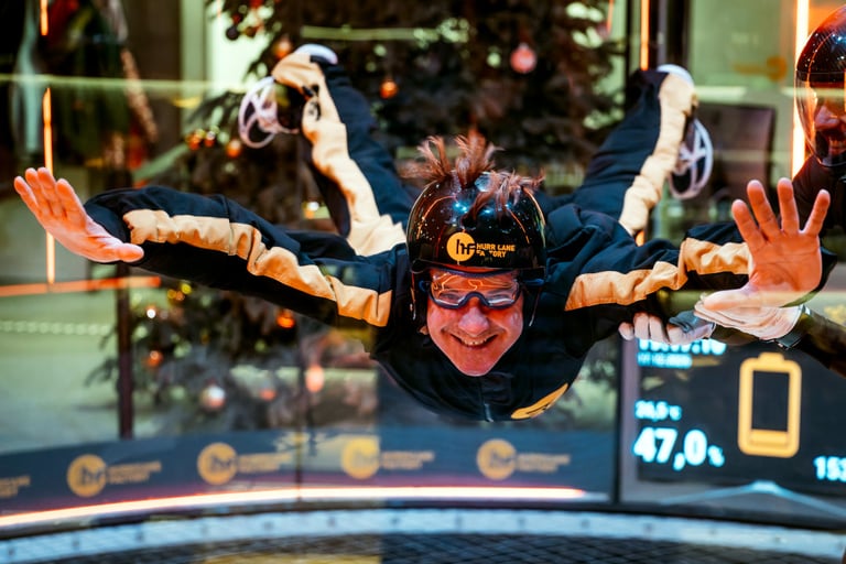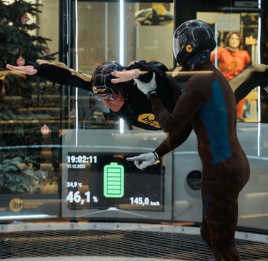 Auch wenn es sich nur um Minuten handelt, die man sich im Windkanal aufhält - für den ersten Versuch ist es dann auch beinahe genug. Schon anstrengend, diese ungewohnte Körperhaltung.